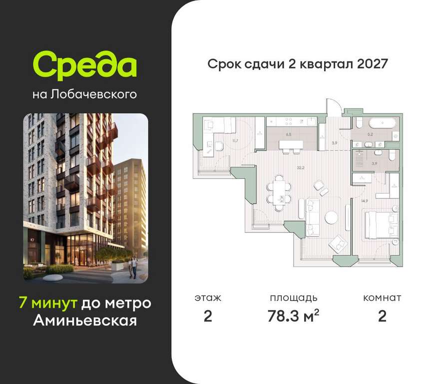 Застройщик - Среда, сдача дома - II квартал 2027 года, высота потолков 2.92 м.