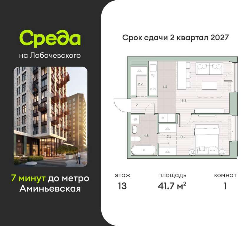 Квартира располагается на 13 этаже 27-этажного дома в ЖК Среда на Лобачевского.