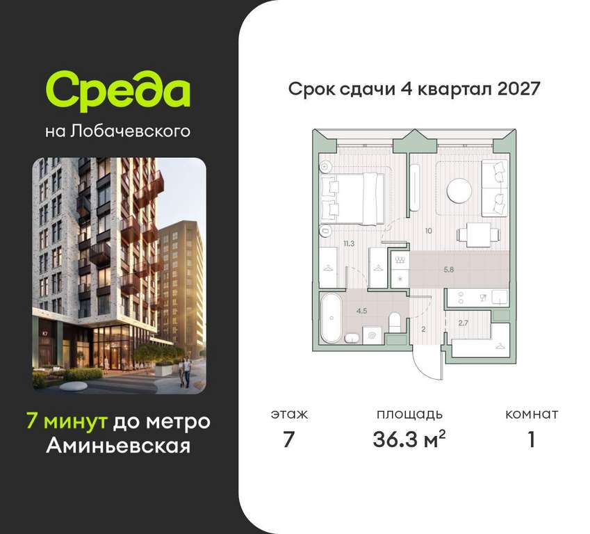 Квартира располагается на 7 этаже 13-этажного дома в ЖК Среда на Лобачевского.