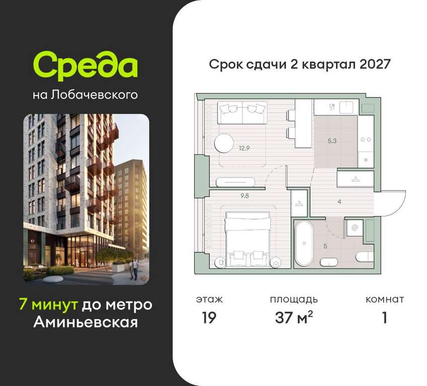 Квартира располагается на 19 этаже 27-этажного дома в ЖК Среда на Лобачевского.