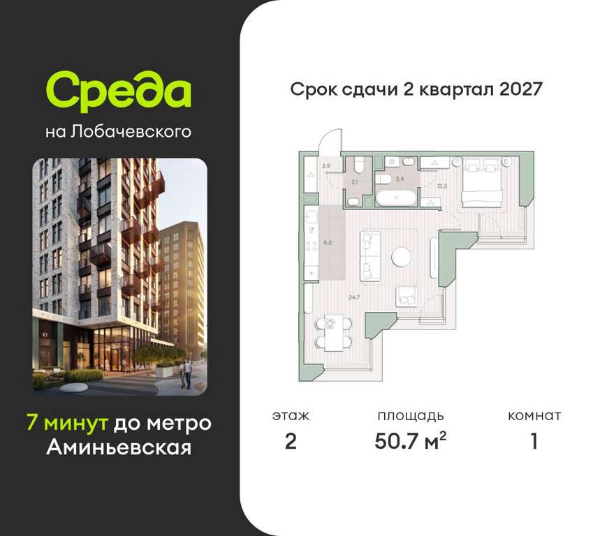 Застройщик - Среда, сдача дома - II квартал 2027 года, высота потолков 2.92 м.