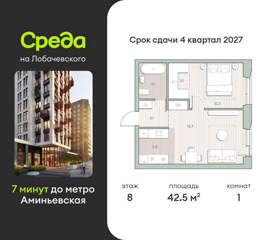 Застройщик - Среда, сдача дома - IV квартал 2027 года, высота потолков 2.92 м.