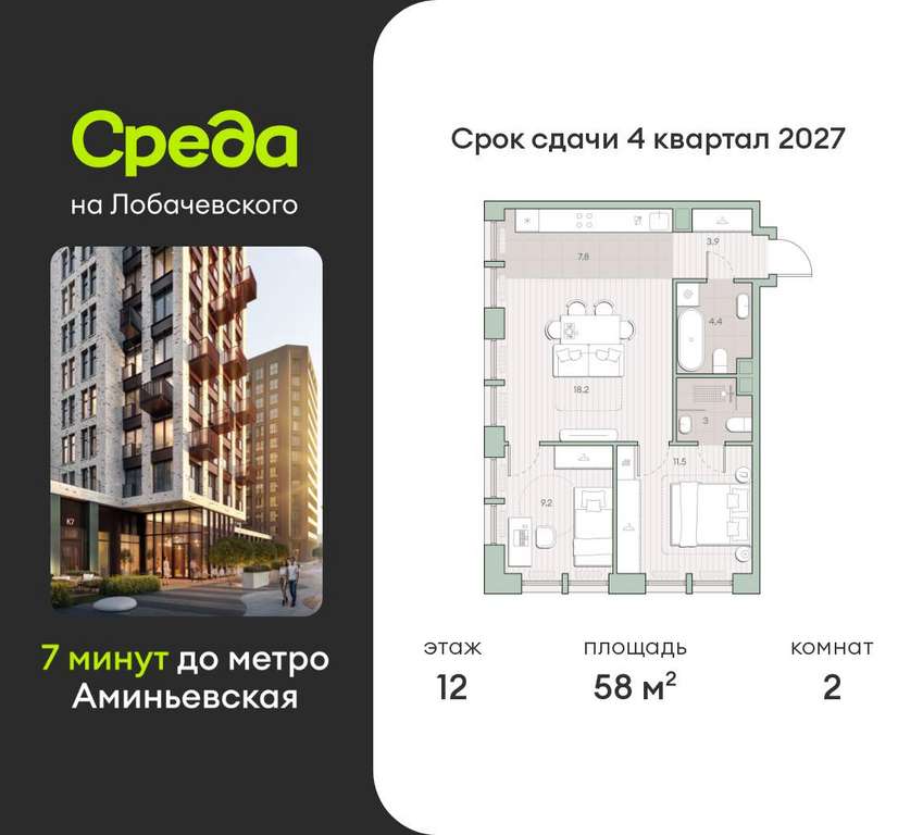 Застройщик - Среда, сдача дома - II квартал 2027 года, высота потолков 2.92 м.