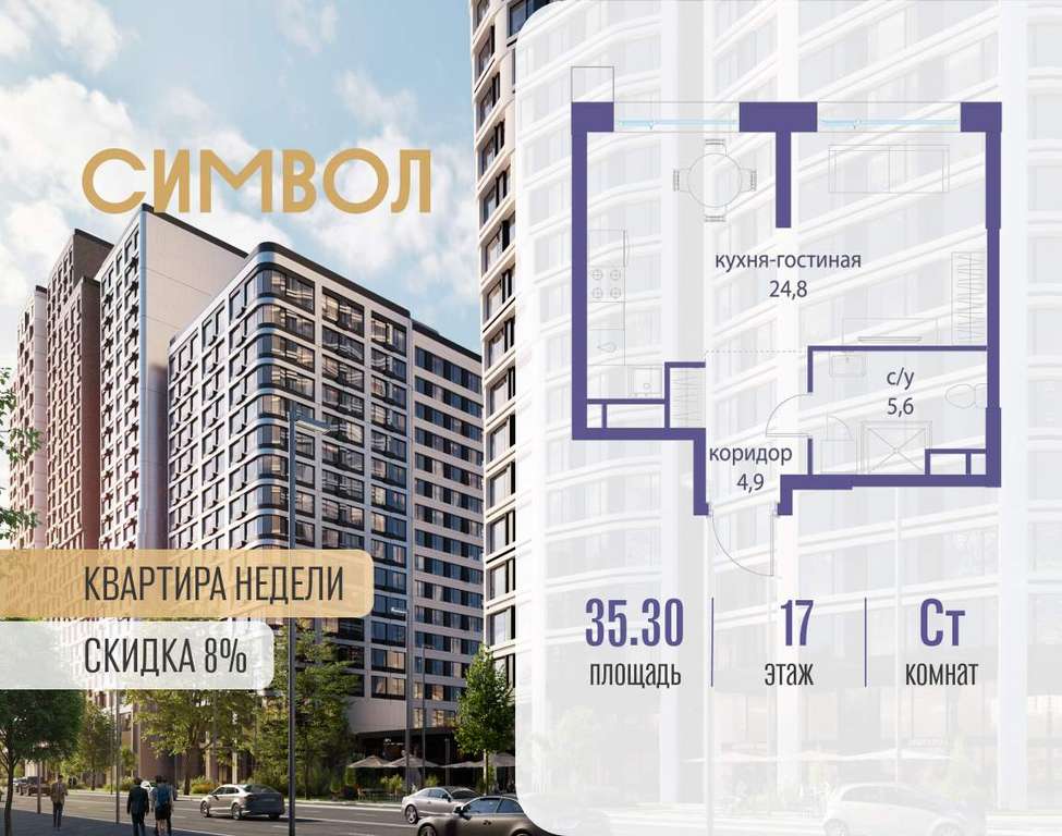 Продается квартира-студия от застройщика: общая площадь 35.30 м, жилая 10.00 м, кухня 14.80 м, 17-й этаж, жилой квартал «Гордость», корпус 36 (секция 4) . Срок сдачи: 2 квартал 2029 года.