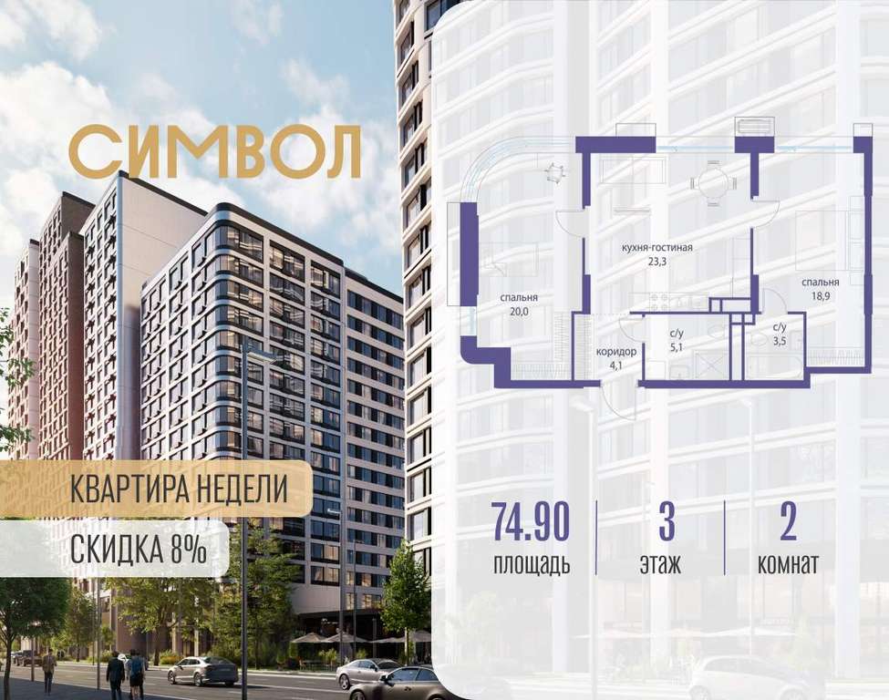 Продается 2-комнатная квартира от застройщика: общая площадь 74.90 м, жилая 38.90 м, кухня 23.30 м, 3-й этаж, жилой квартал «Гордость», корпус 36 (секция 2) . Срок сдачи: 2 квартал 2029 года.