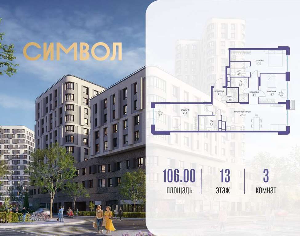 Продается 3-комнатная квартира от застройщика: общая площадь 106.00 м, жилая 51.50 м, кухня 27.30 м, 13-й этаж, жилой квартал «Гордость», корпус 36 (секция 2) . Срок сдачи: 2 квартал 2029 года.