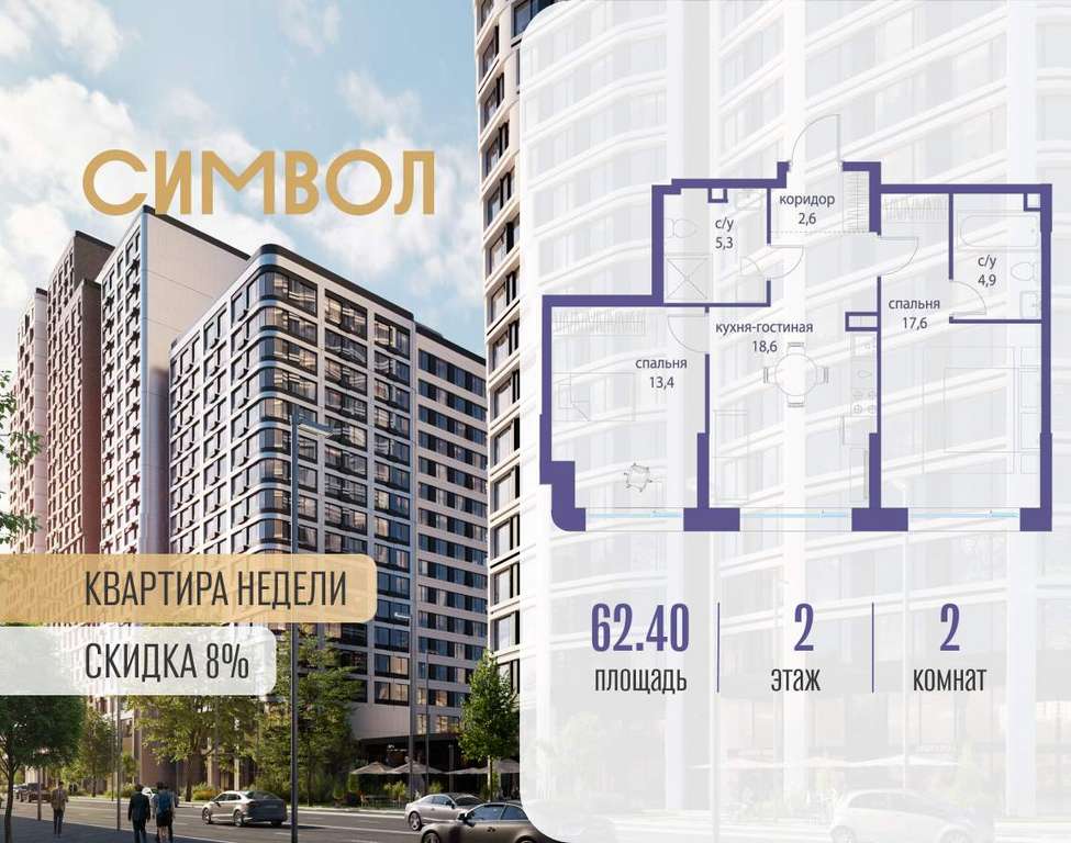 Продается 2-комнатная квартира от застройщика: общая площадь 62.40 м, жилая 31.00 м, кухня 18.60 м, 2-й этаж, жилой квартал «Гордость», корпус 36 (секция 3) . Срок сдачи: 2 квартал 2029 года.