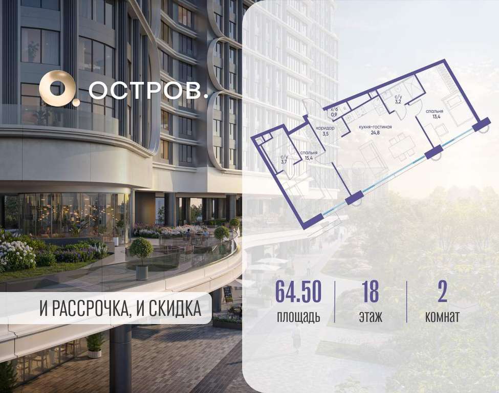 Продаётся 2-комн. квартира от застройщика: общая площадь 64.50 м, жилая 28.80 м, кухня 24.80 м, 18-й этаж, жилой квартал «Остров 7», корпус 7 (секция 1) . Срок сдачи: 3 квартал 2028 года.