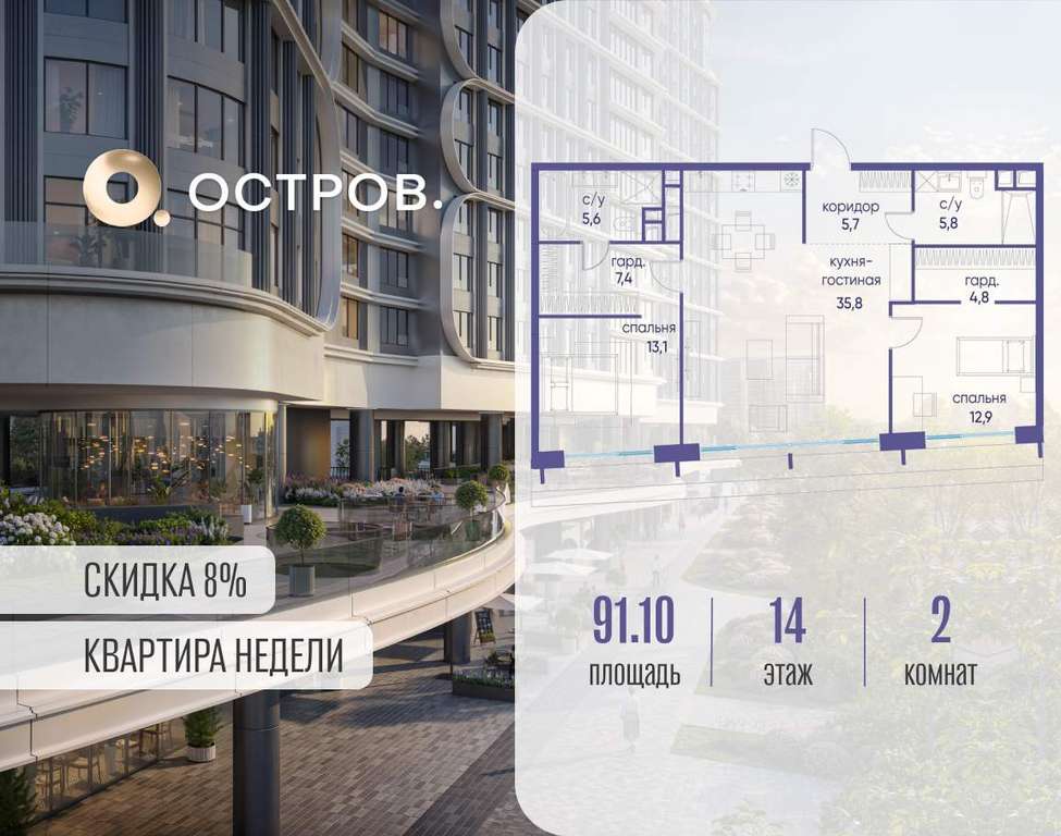 Продаётся 2-комн. квартира от застройщика: общая площадь 91.10 м, жилая 26.00 м, кухня 35.80 м, 14-й этаж, жилой квартал «Остров 7», корпус 5 (секция 1) . Срок сдачи: 3 квартал 2028 года.