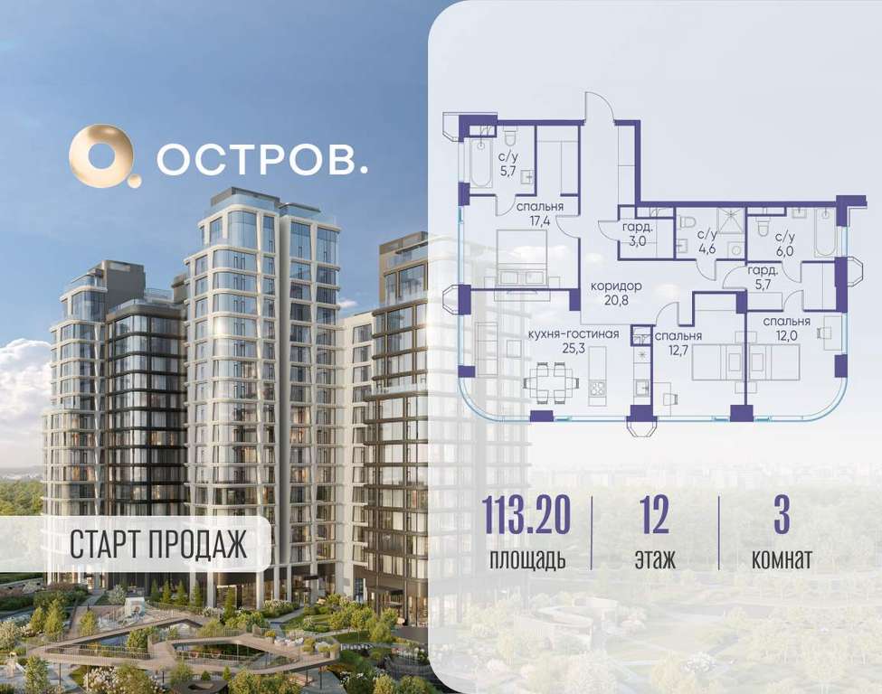 Продаётся 3-комн. квартира от застройщика: общая площадь 113.20 м, жилая 42.10 м, кухня 25.30 м, 12-й этаж, жилой квартал «Остров 12», корпус 1 (секция 1) . Срок сдачи: 1 квартал 2029 года.