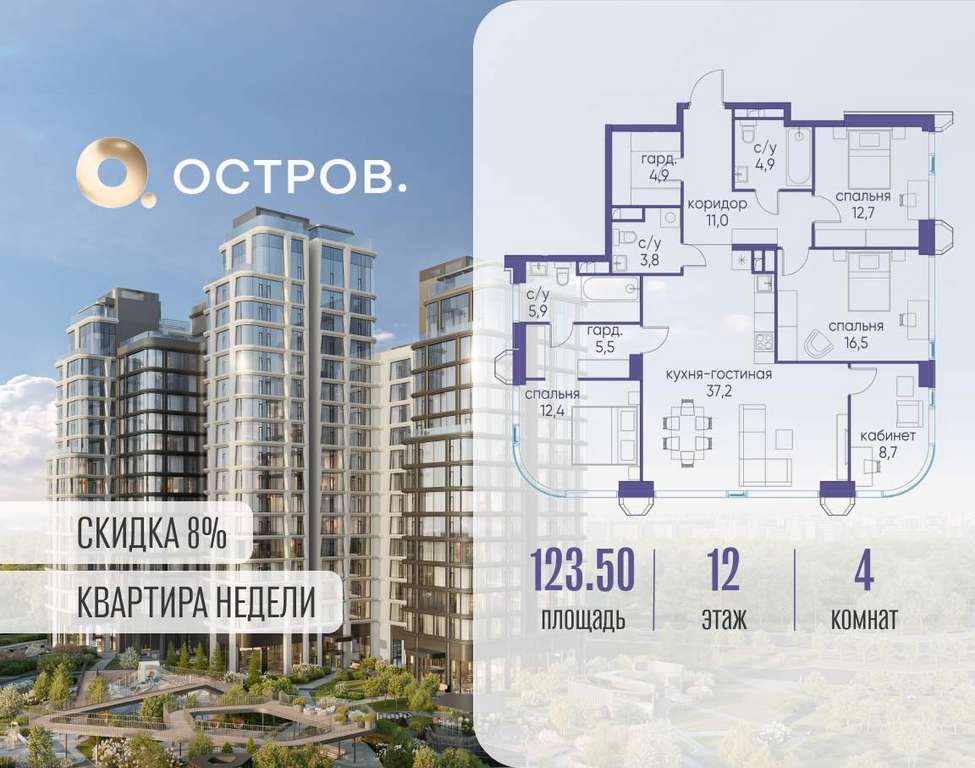 Продаётся 4-комн. квартира от застройщика: общая площадь 123.50 м, жилая 50.30 м, кухня 37.20 м, 12-й этаж, жилой квартал «Остров 12», корпус 1 (секция 2) . Срок сдачи: 1 квартал 2029 года.