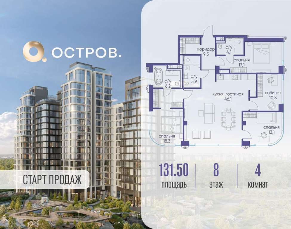 Продаётся 4-комн. квартира от застройщика: общая площадь 131.50 м, жилая 59.30 м, кухня 46.10 м, 8-й этаж, жилой квартал «Остров 12», корпус 1 (секция 3) . Срок сдачи: 1 квартал 2029 года.