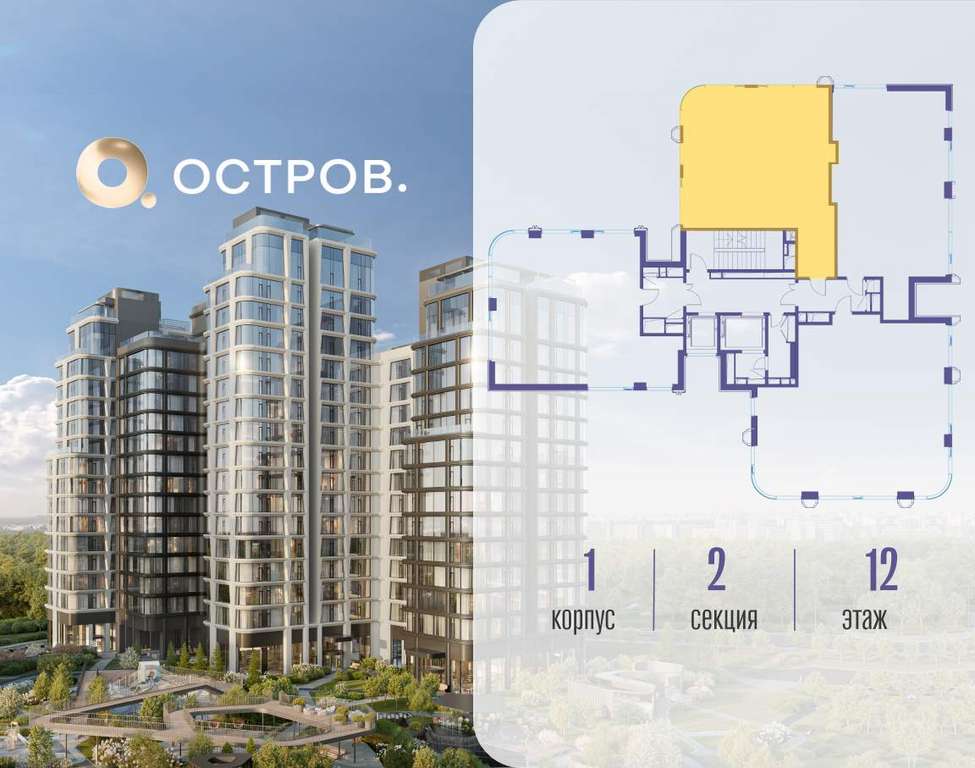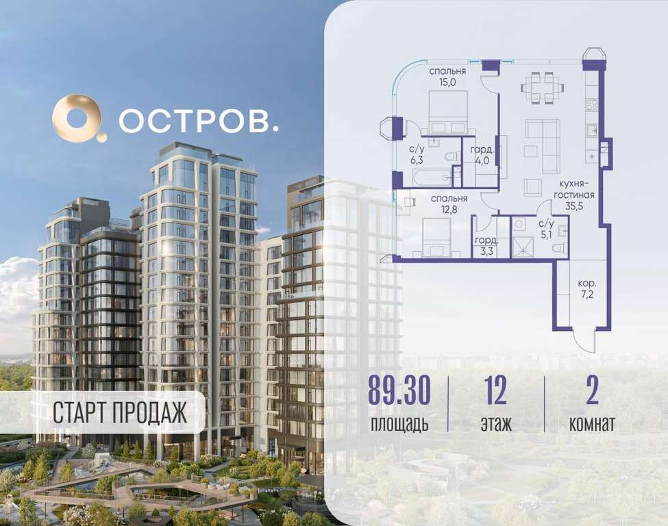 Продаётся 2-комн. квартира от застройщика: общая площадь 89.30 м, жилая 27.80 м, кухня 35.50 м, 12-й этаж, жилой квартал «Остров 12», корпус 1 (секция 2) . Срок сдачи: 1 квартал 2029 года.