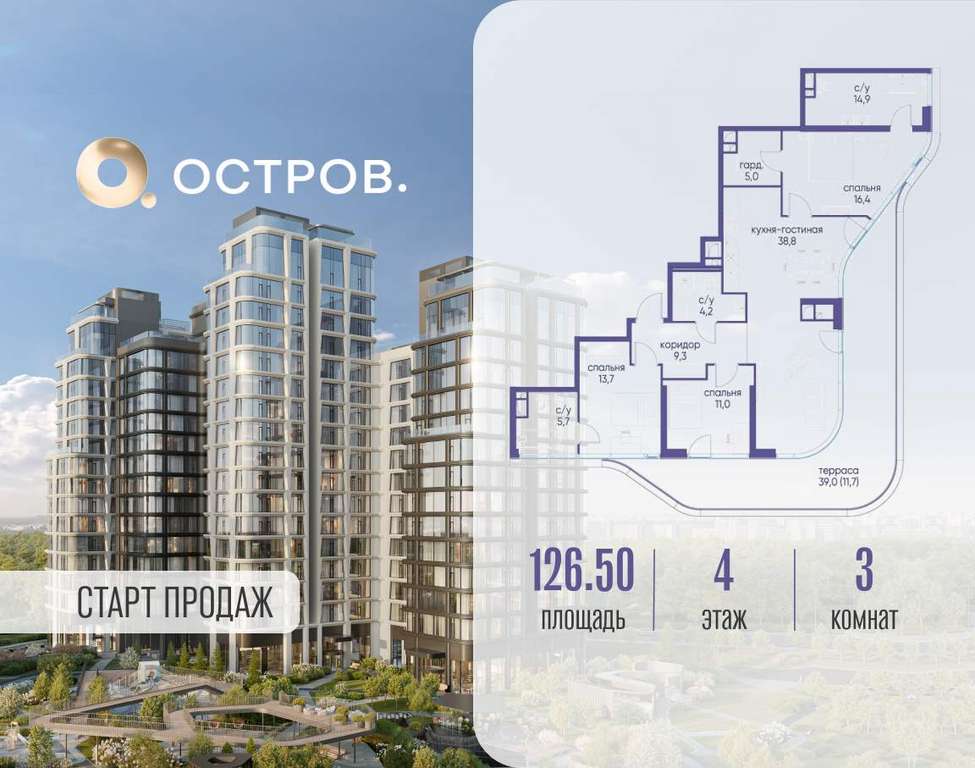 Продаётся 3-комн. квартира от застройщика: общая площадь 126.50 м, жилая 41.10 м, кухня 38.80 м, 4-й этаж, жилой квартал «Остров 12», корпус 6 (секция 1) . Срок сдачи: 1 квартал 2029 года.