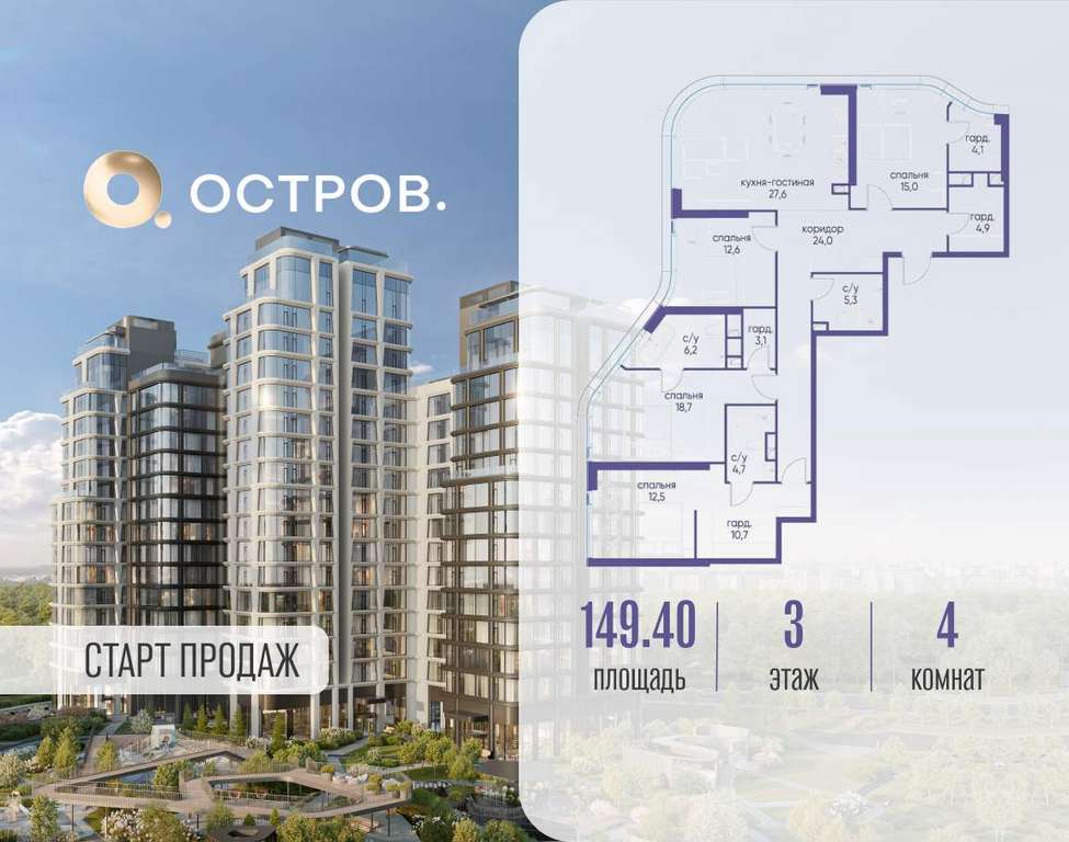Продаётся 4-комн. квартира от застройщика: общая площадь 149.40 м, жилая 58.80 м, кухня 27.60 м, 3-й этаж, жилой квартал «Остров 12», корпус 6 (секция 9) . Срок сдачи: 1 квартал 2029 года.