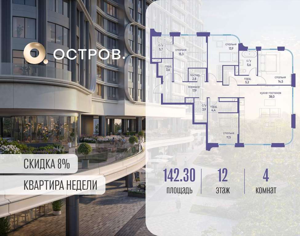 Продаётся 4-комн. квартира от застройщика: общая площадь 142.30 м, жилая 55.20 м, кухня 38.00 м, 12-й этаж, жилой квартал «Остров 7», корпус 2 (секция 1) . Срок сдачи: 1 квартал 2028 года.