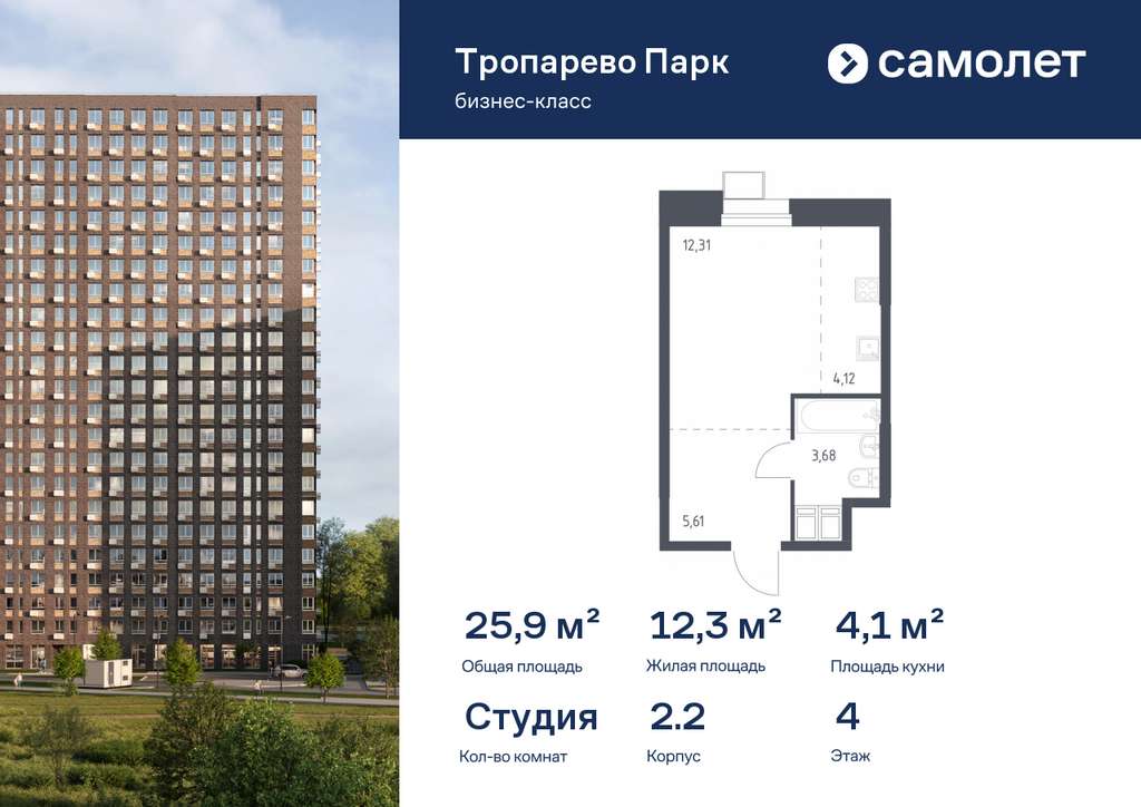 Строим кварталы для жизни с заботой о будущем. Предлагаются апартаменты студия бизнес-класса 25,86 кв. м в корпусе 2.2 на 4 этаже, в МФК «Тропарево Парк»