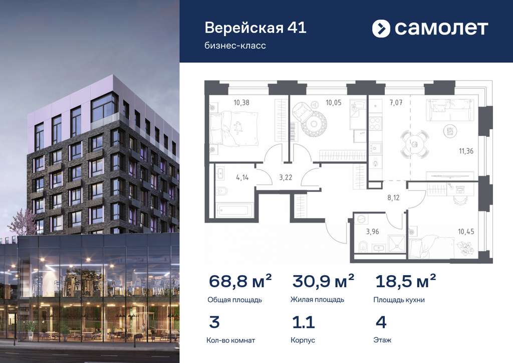 Строим кварталы для жизни с заботой о будущем. Предлагается 3-комнатная квартира бизнес-класса 68,75 кв. м в корпусе 1.1 на 4 этаже, в «Верейская 41»