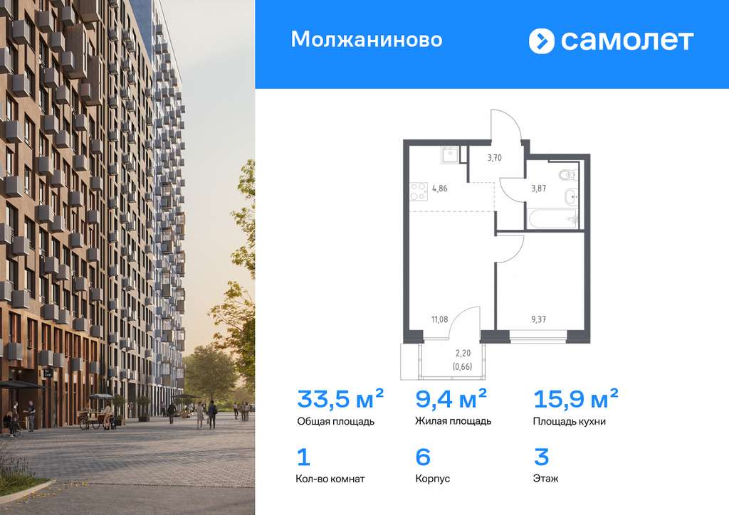 Строим кварталы для жизни с заботой о будущем. Предлагается 1-комнатная квартира комфорт-класса 33,54 кв. м в корпусе 6 на 3 этаже, в ЖК «Молжаниново»