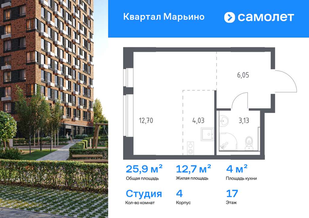 Строим кварталы для жизни с заботой о будущем. Предлагается квартира студия комфорт-класса 25,91 кв. м в корпусе 4 на 17 этаже, в ЖК «Квартал Марьино»