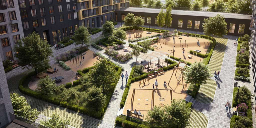 В закрытых дворах-парках предусмотрены игровые площадки, лужайки для пикников и йоги. Пространства для спокойного отдыха будут огорожены живыми изгородями.
