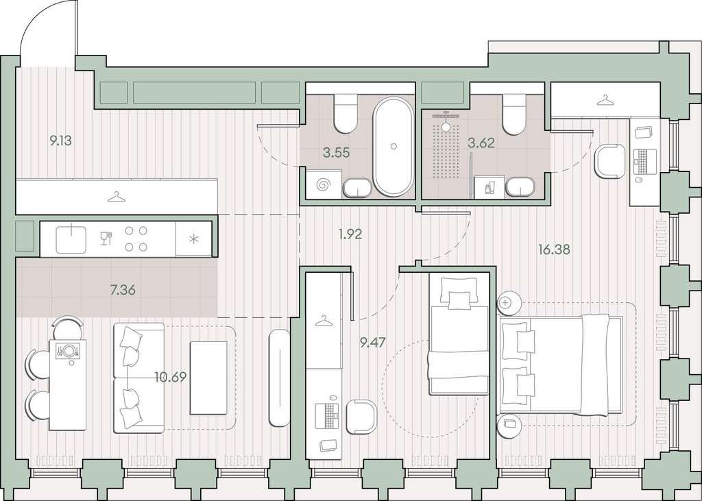 Жилая площадь 25.85 м2, кухня 7.36 м2, предчистовая отделка, комнаты изолированные.