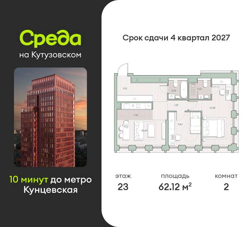 Проект сочетает в себе ритмичность и динамичность, благодаря своей архитектуре, при он этом окружен зеленью и парками. «Среда на Кутузовском» погружает в активный и разнообразный образ жизни, дает вариативные возможности досуга и вдохновляет на новые свершения.