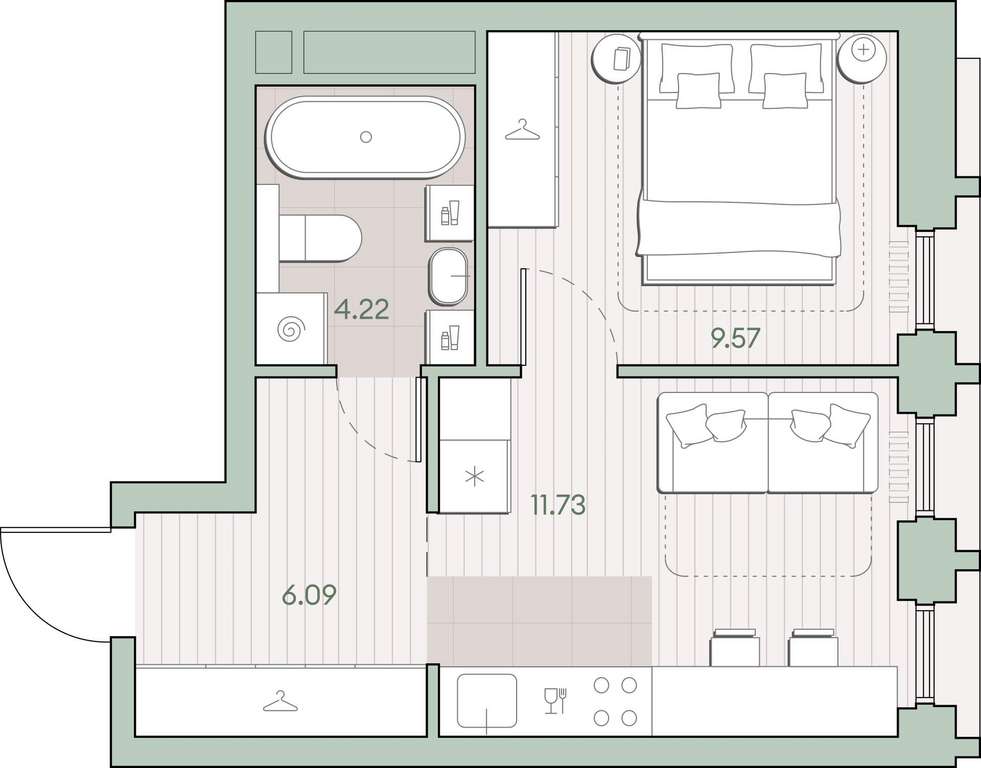 Жилая площадь 9.57 м2, кухня 11.73 м2, предчистовая отделка, комнаты изолированные.