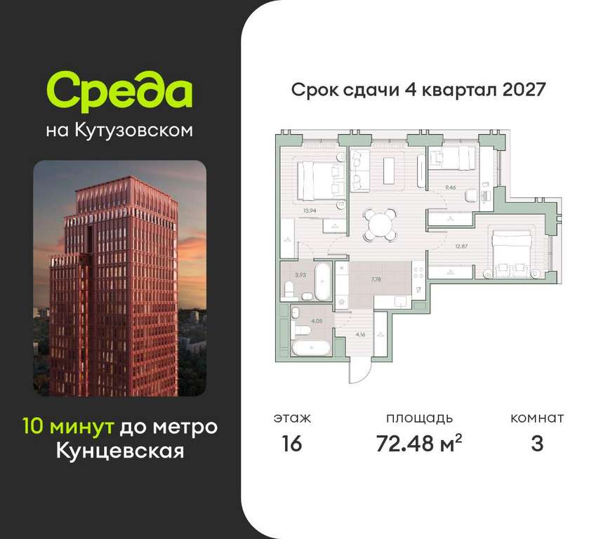 Квартира располагается на 16 этаже 30-этажного дома в ЖК Среда на Кутузовском.