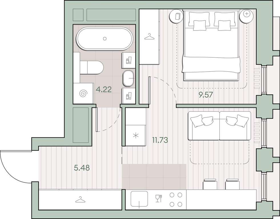 Жилая площадь 9.57 м2, кухня 11.73 м2, предчистовая отделка, комнаты изолированные.