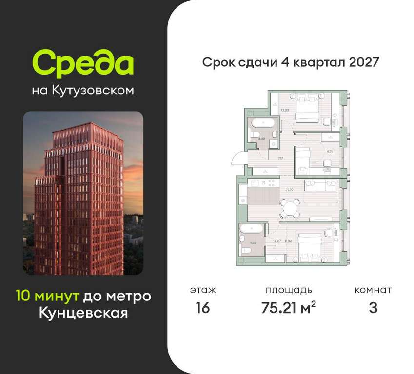 Квартира располагается на 16 этаже 30-этажного дома в ЖК Среда на Кутузовском.