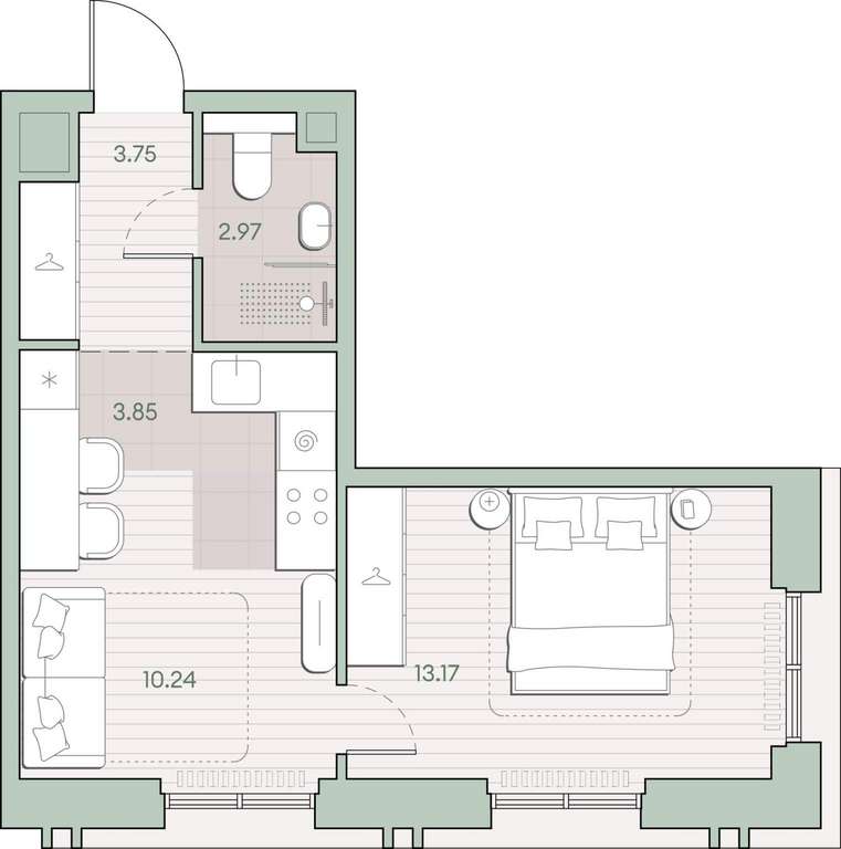 Жилая площадь 13.17 м2, кухня 3.85 м2, предчистовая отделка, комнаты изолированные.