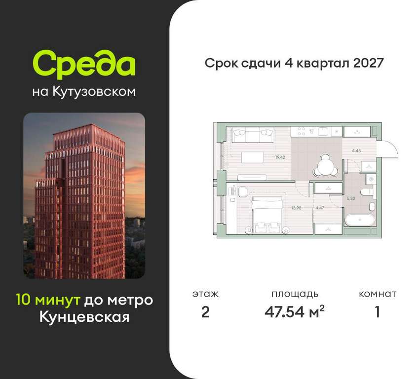 Продается 1-комн. квартира, площадью 47.54 м2 в монолитной новостройке в 12 мин. пешком от м. Кунцевская, район города - Кунцево. Возможен вариант покупки с использованием ипотечных средств, есть рассрочка.