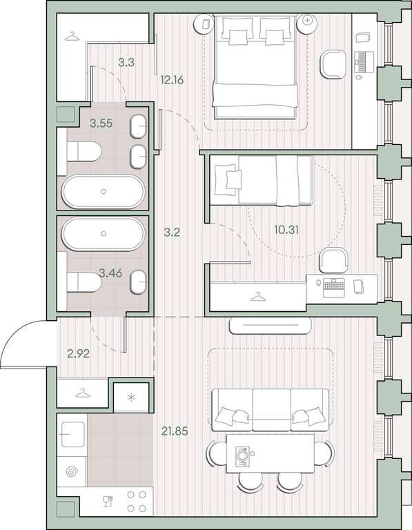 Жилая площадь 22.47 м2, кухня 22.07 м2, предчистовая отделка, комнаты изолированные.