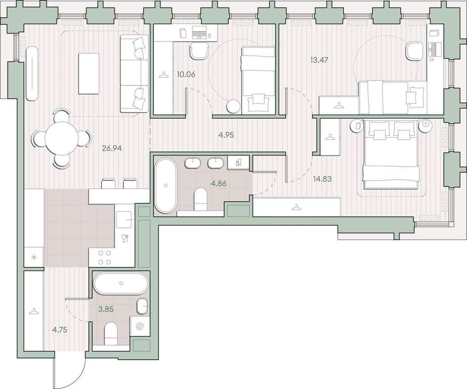 Жилая площадь 38.36 м2, кухня 26.94 м2, предчистовая отделка, комнаты изолированные.