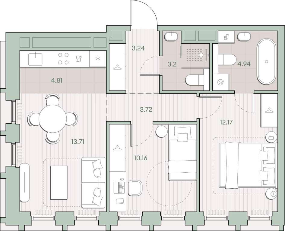 Жилая площадь 22.33 м2, кухня 4.81 м2, предчистовая отделка, комнаты изолированные.