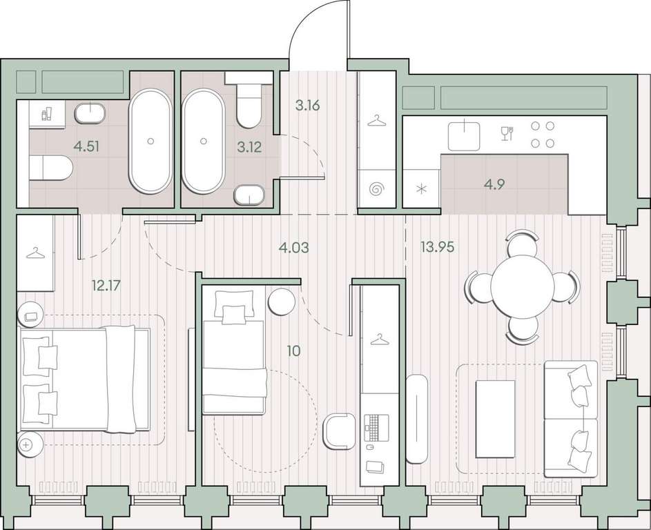 Жилая площадь 22.17 м2, кухня 4.9 м2, предчистовая отделка, комнаты изолированные.