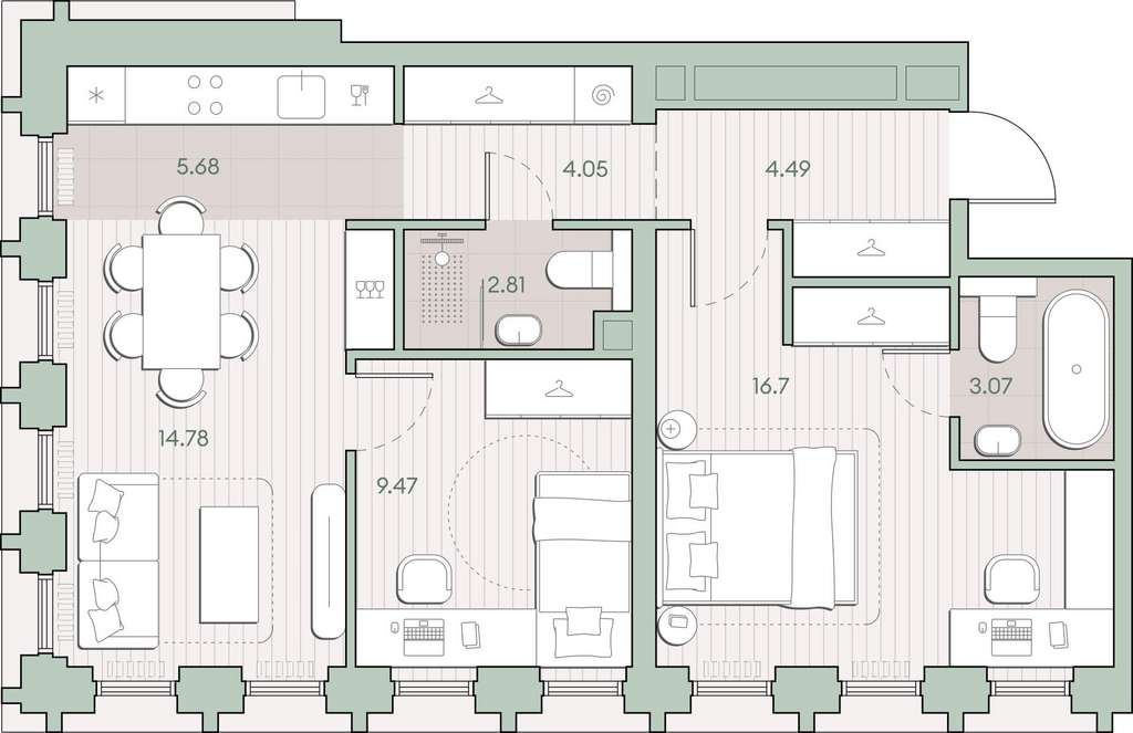 Жилая площадь 26.17 м2, кухня 5.68 м2, предчистовая отделка, комнаты изолированные.