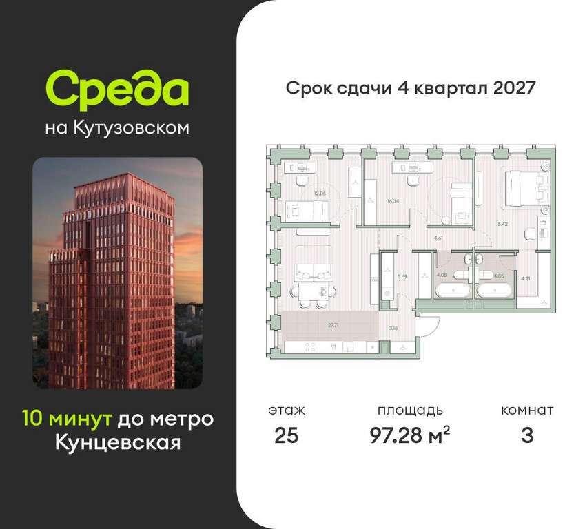 Застройщик - Среда, сдача дома - IV квартал 2027 года, высота потолков 2.92 м.
