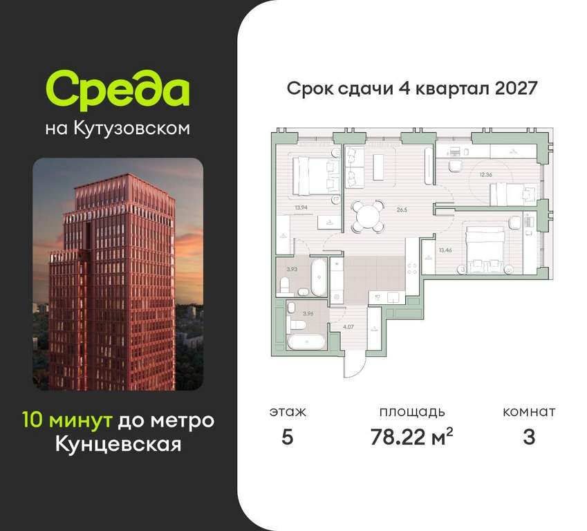 Квартира располагается на 5 этаже 30-этажного дома в ЖК Среда на Кутузовском.