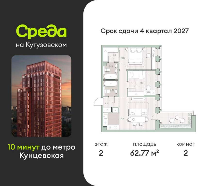 Проект сочетает в себе ритмичность и динамичность, благодаря своей архитектуре, при он этом окружен зеленью и парками. «Среда на Кутузовском» погружает в активный и разнообразный образ жизни, дает вариативные возможности досуга и вдохновляет на новые свершения.