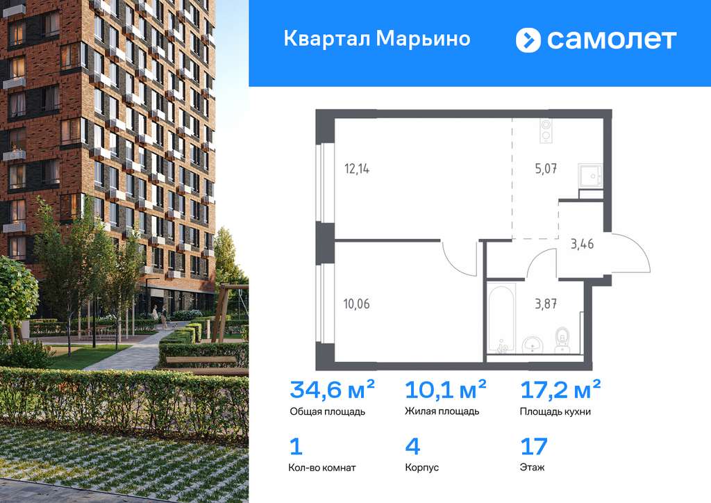 Строим кварталы для жизни с заботой о будущем. Предлагается 1-комнатная квартира комфорт-класса 34,6 кв. м в корпусе 4 на 17 этаже, в ЖК «Квартал Марьино»