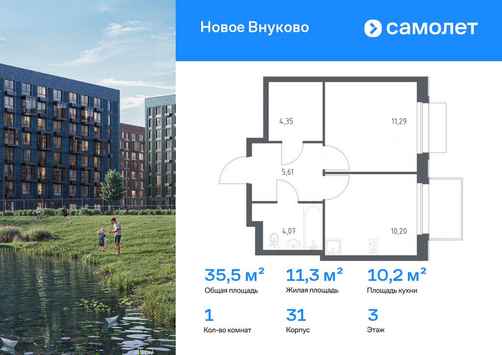 Строим кварталы для жизни с заботой о будущем. Предлагается 1-комнатная квартира комфорт-класса 35,52 кв. м в корпусе 31 на 3 этаже, в ЖК «Новое Внуково»