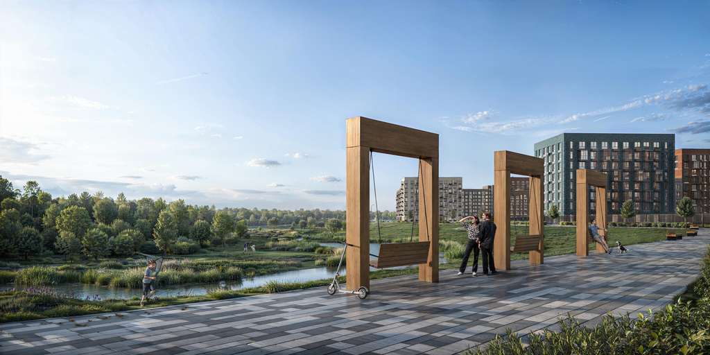 Дворы-парки закрыты от машин и посторонних. На территории — прогулочный маршрут вдоль реки Незнайка и набережная с шезлонгами и качелями для отдыха. Также здесь появится плейхаб «Незнайка на Луне», площадь для мероприятий с сухим фонтаном, летним кинотеатром и кафе.