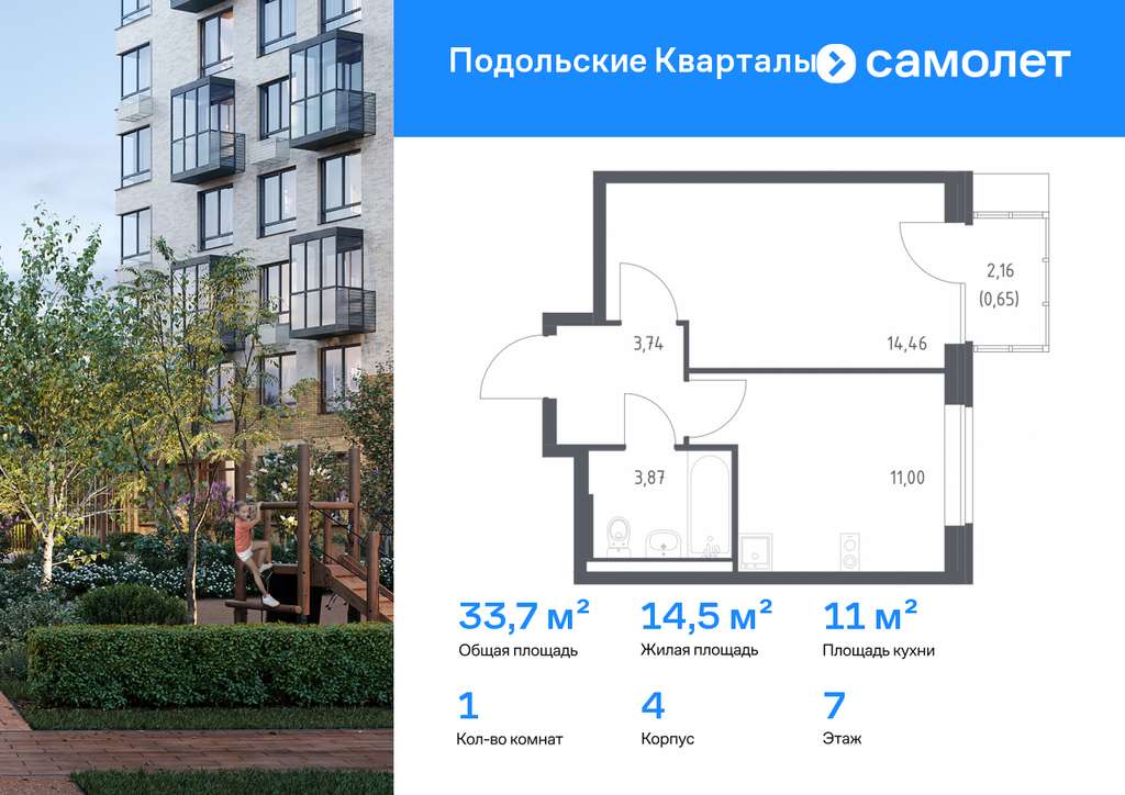 Строим кварталы для жизни с заботой о будущем. Предлагается 1-комнатная квартира комфорт-класса 33,72 кв. м в корпусе 4 на 7 этаже, в ЖК «Подольские Кварталы»