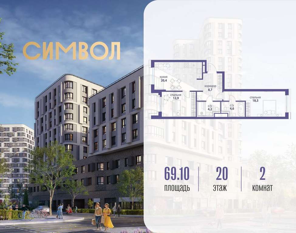 Продается 2-комнатная квартира от застройщика: общая площадь 69.10 м, жилая 31.20 м, кухня 20.40 м, 20-й этаж, жилой квартал «Вдохновение», корпус 33 (секция 3) . Срок сдачи: 4 квартал 2027 года.