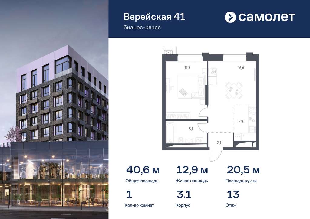 Строим кварталы для жизни с заботой о будущем. Предлагается 1-комнатная квартира бизнес-класса 40,58 кв. м в корпусе 3.1 на 13 этаже, в «Верейская 41» Квартира с предчистовой отделкой. Доступность дополнительных опций уточняйте у застройщика. Приобрести квартиру возможно по специальным акциям от застройщика, с текущими условиями акций можно ознакомиться в блоке «Акций». Цена динамическая и может отличаться, уточняйте актуальность у застройщика. «Верейская 41» — проект бизнес-класса рядом с «Долиной реки Сетунь» и Кутузовским проспектом. Из панорамных окон открываются виды на природный заказник. Комплекс включает 4 урбан-блока высотой до 14 этажей, зеленые террасы, сад с навесами из растений, спортивные и игровые площадки, плоскостной и 2 подземных паркинга. Планировки сдаются с дизайнерской отделкой в природных тонах.