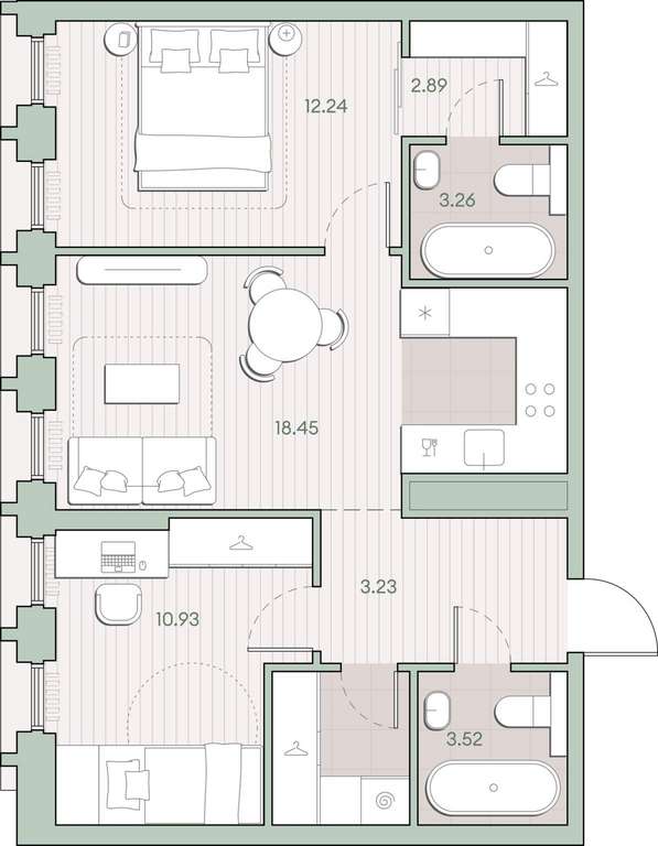Жилая площадь 23.17 м2, кухня 18.45 м2, предчистовая отделка, комнаты изолированные.