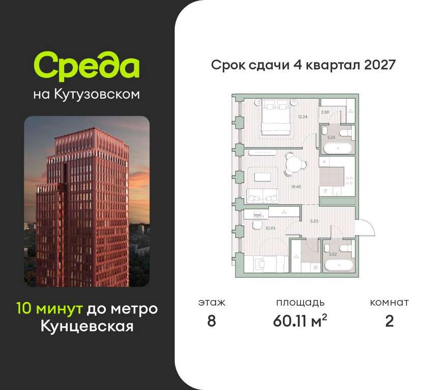 Проект сочетает в себе ритмичность и динамичность, благодаря своей архитектуре, при он этом окружен зеленью и парками. «Среда на Кутузовском» погружает в активный и разнообразный образ жизни, дает вариативные возможности досуга и вдохновляет на новые свершения.