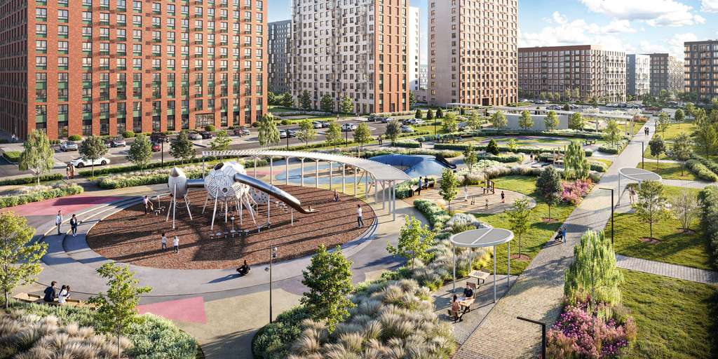 Дворы-парки закрыты от машин и посторонних. На территории — прогулочный маршрут вдоль реки Незнайка и набережная с шезлонгами и качелями для отдыха. Также здесь появится плейхаб «Незнайка на Луне», площадь для мероприятий с сухим фонтаном, летним кинотеатром и кафе.